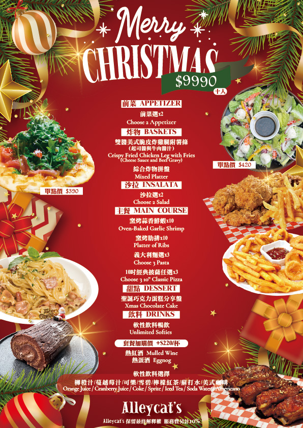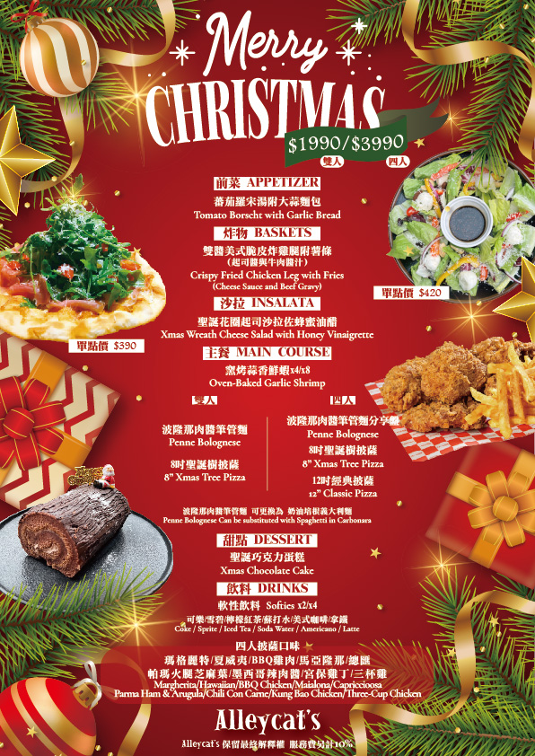 每年最具有派對氣氛代表性的月份,那便是12月了 Alleycats Pizza 隆重推出跨年度壓軸,最驚喜也是最優惠的派對美食金選提案, 讓您來Alleycats Pizza聚餐,可以享受最豐富也最美味的派對美食!